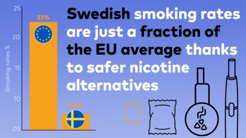ในสวีเดน ซึ่งมีอัตราการสูบบุหรี่ 5.6% 1 พร้อมกลายเป็นประเทศ ‘ปลอดบุหรี่’ ภายในปีนี้ อัตราการสูบบุหรี่ที่ลดลงเมื่อเร็วๆ นี้ เป็นผลจากผลิตภัณฑ์นิโคตินที่เพิ่มขึ้นในปี 2019