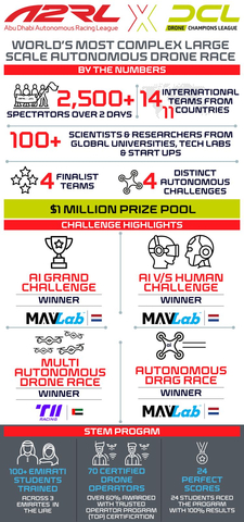 Abu Dhabi Autonomous Racing League (A2RL) ซึ่งเป็นส่วนหนึ่งของ Advanced Technology Research Council (ATRC) ร่วมมือกับ Drone Champions League (DCL) จัดงานแข่งขัน A2RL x DCL Autonomous Drone Championship ครั้งแรกในตะวันออกกลางที่ ADNEC Marina Hall เมืองอาบูดาบี สหรัฐอาหรับเอมิเรตส์ ถือเป็นความก้าวหน้าครั้งสำคัญด้านการบินอัตโนมัติและหุ่นยนต์ทางอากาศ โดรน AI ของทีม MavLab สามารถแซงหน้านักบินมนุษย์ชั้นนำของโลกและคว้าชัยชนะในการแข่งขัน AI vs Human Challenge ได้สำเร็จ การแข่งขันแบบตัวต่อตัวครั้งนี้ถือเป็นการแข่งขันที่ซับซ้อนที่สุดเท่าที่เคยมีมา โดยมีผู้เข้าชิงรางวัลชนะเลิศจาก DCL Falcon Cup ซึ่งบางท่านเป็นนักบินโดรนชั้นนำของโลก